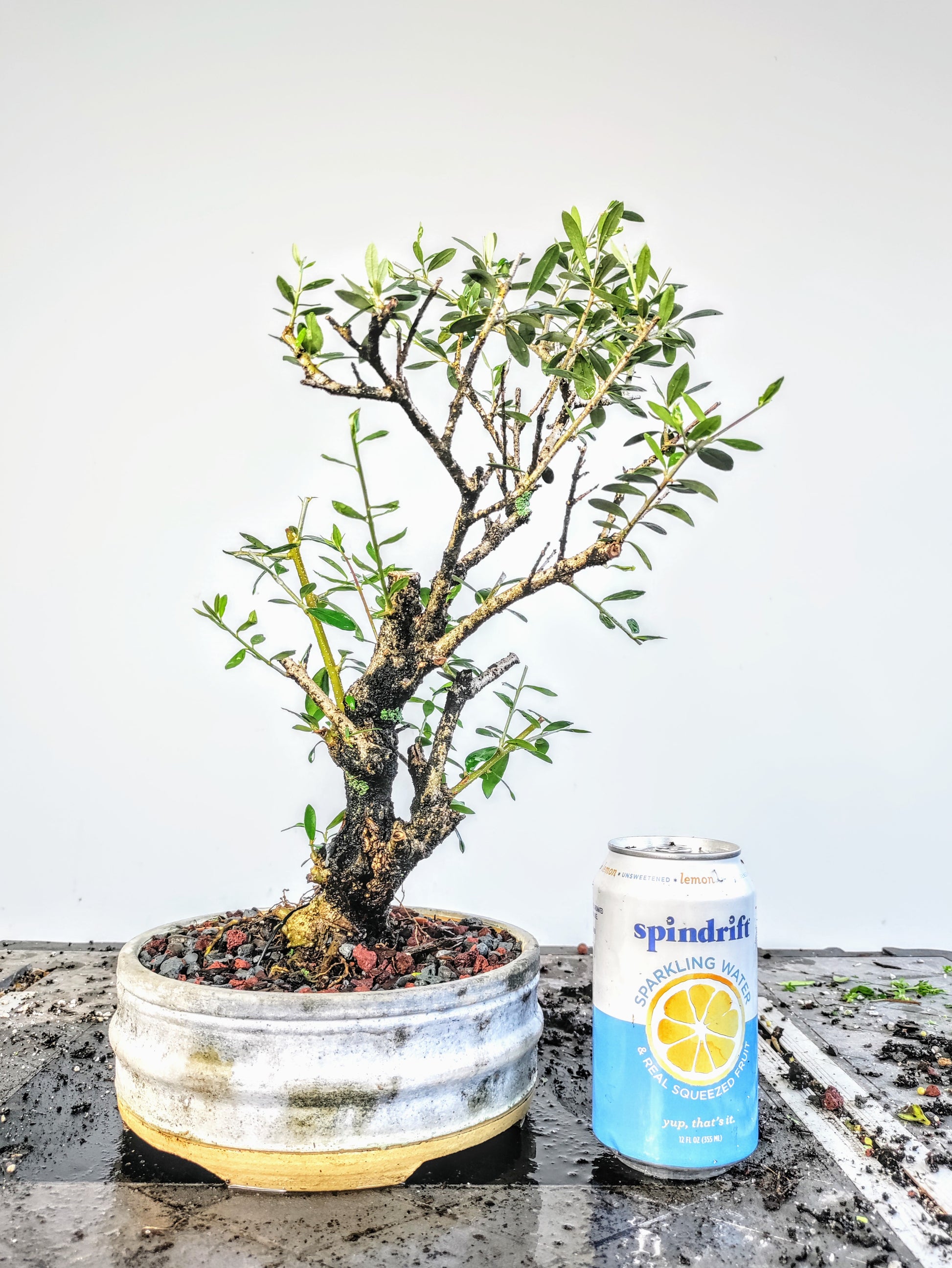 Dwarf Olive is a Mediterranean species that does well in tropical climates. This olive is growing in a green, 8 inch bonsai pot.