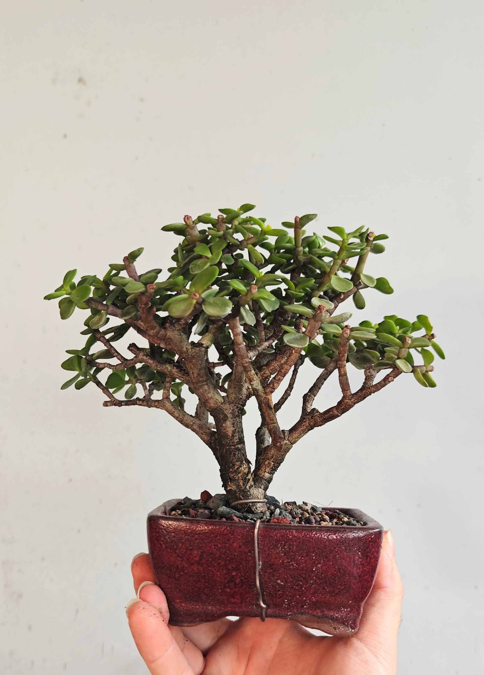 Dwarf jade is a tropical species that is easy to care for. It tolerates variances in water and sunlight, but Prefers full Sun in well draining soil. Dwarf jade is more drough resistant than other species, which means it requires less watering than most other bonsai. Dwarf jade should be kept above freezing temperatures.